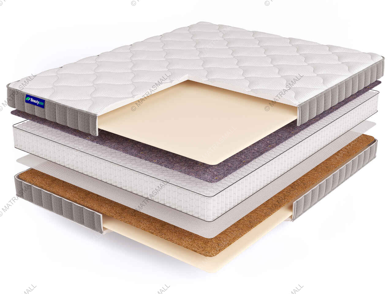 Сторона с экококосом более жесткая. Основными его свойствами являются высокая устойчивость к нагрузкам, отсутствие запаха, поддержание здорового микроклимата в матрасе, за счет высокой воздухопроницаемости.
