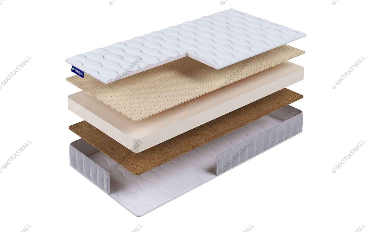 Матрас не имеет пружинного блока, что делает его более мягким и равномерным по поддержке. Основу матраса составляют натуральный латекс, пена Airfoam и латексированный кокос. Натуральный латекс обеспечивает упругость и безопасность, адаптируясь к форме тела ребенка. Упругая пена Airfoam обладает отличной вентилируемостью, помогая поддерживать оптимальный температурный режим. Латексированный кокос придает матрасу жесткость, повышая его прочность.