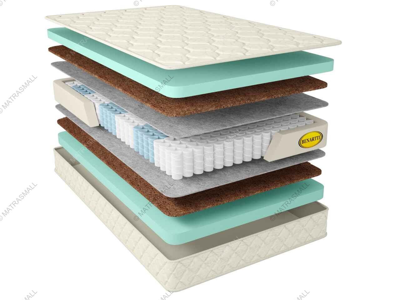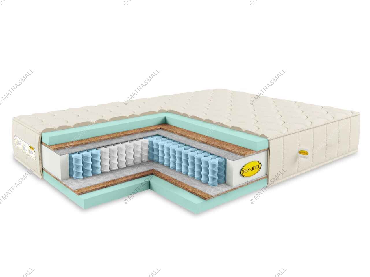 С каждой стороны расположен слой кокосовой койры толщиной 1 см, придающий дополнительную жесткость и долговечность матрасу и поверх слой искусственного латекса высотой 5 см, обладающий ортопедическим эффектом и износостойкими свойствами.