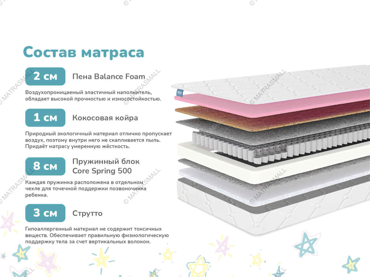 Натуральная койра кокоса делает одну из спальных сторон матраса более жёсткой и прочной. Ортопедические качества наполнителя позволяют отлично удерживать спину и придавать позвоночнику ребёнка анатомически правильное положение.