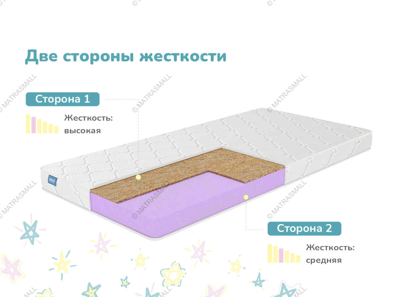 У матраса полностью гипоаллергенное наполнение и две стороны жёсткости – высокая и средняя. По мере роста ребёнка можно менять плотность спального места и адаптировать матрас под возрастные изменения и потребности.