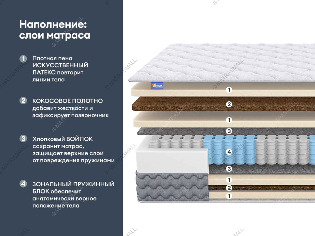4 слоя искусственного латекса - пена сочетает мягкое погружение, упругую поддержку и стабилизацию, подстраиваясь под контуры тела без потери плотности.