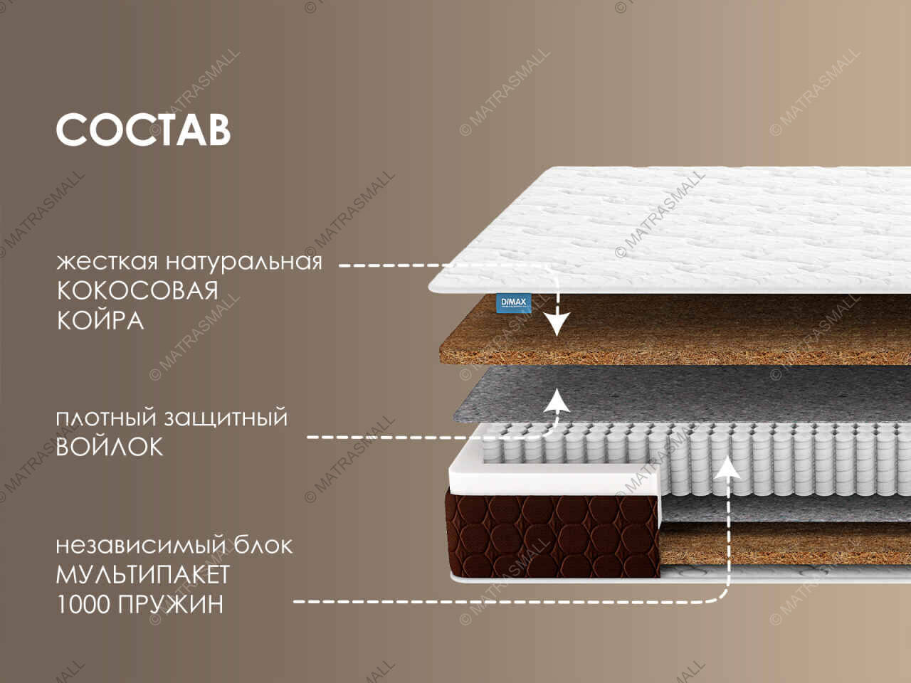 Мощные слои из кокосовой койры - максимальная жесткость и вентиляция для профилактики провисаний и сохранения анатомически правильного положения спины.