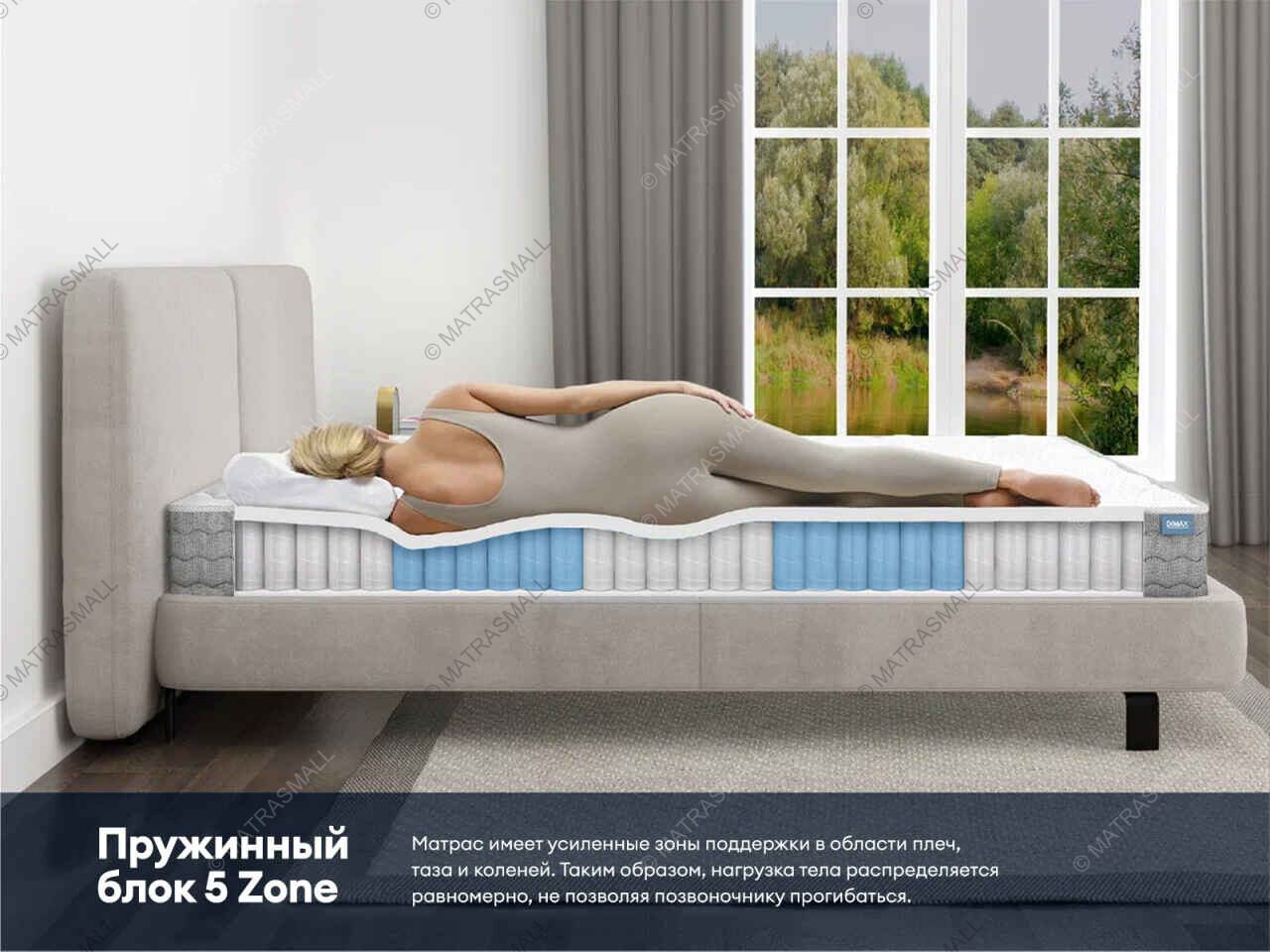 Высокая плотность пружин в пружинном блоке 5Zone обеспечивает равномерное распределение нагрузки и точечную поддержку позвоночника. В то же время разная жёсткость пружин позволяет оказывать более выраженную поддержку областям плеч, спины и бедер.