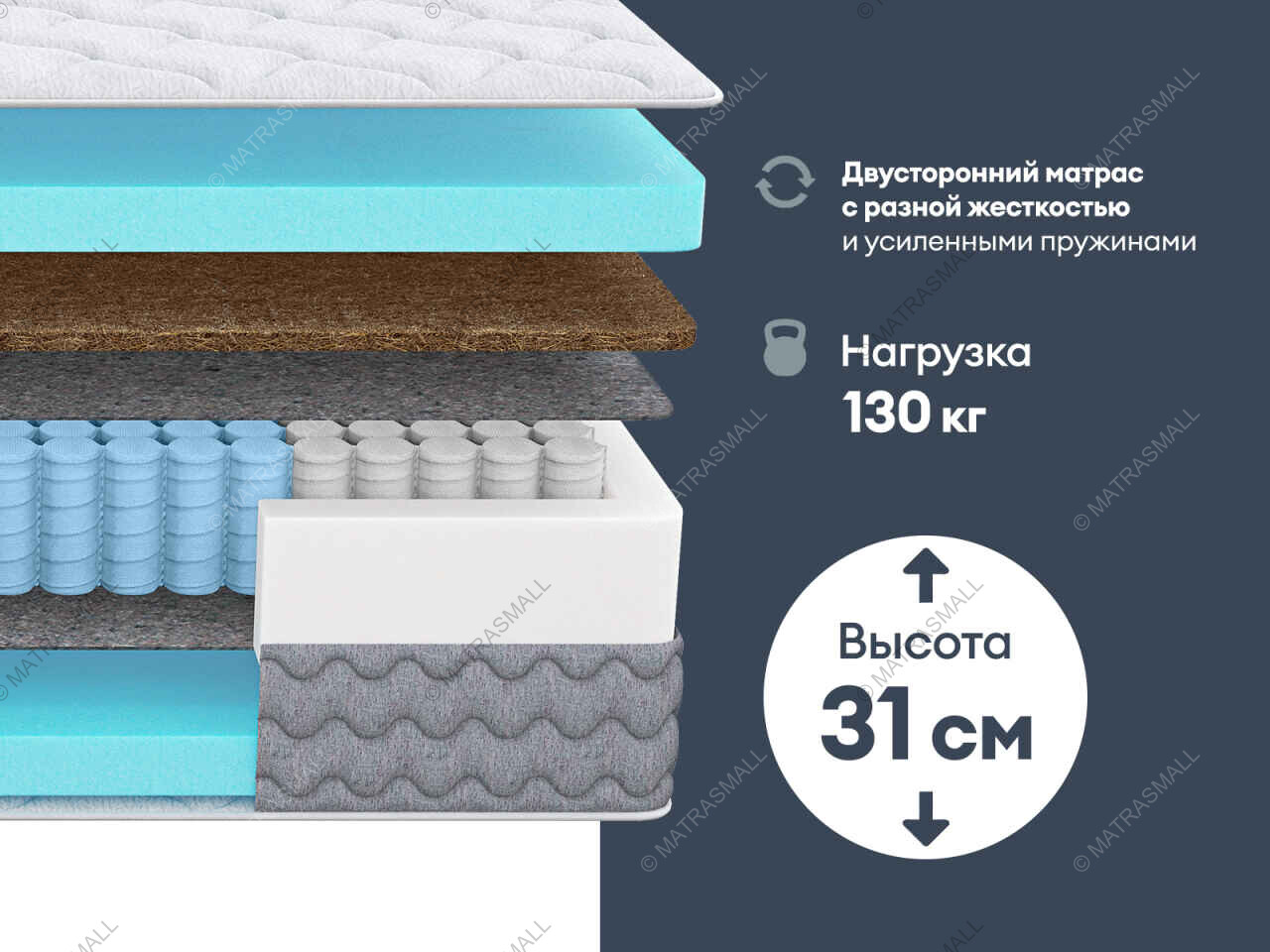 Модель имеет две стороны разной жёсткости — выше средней и средней, позволяя легко адаптировать матрас под индивидуальные предпочтения комфорта.