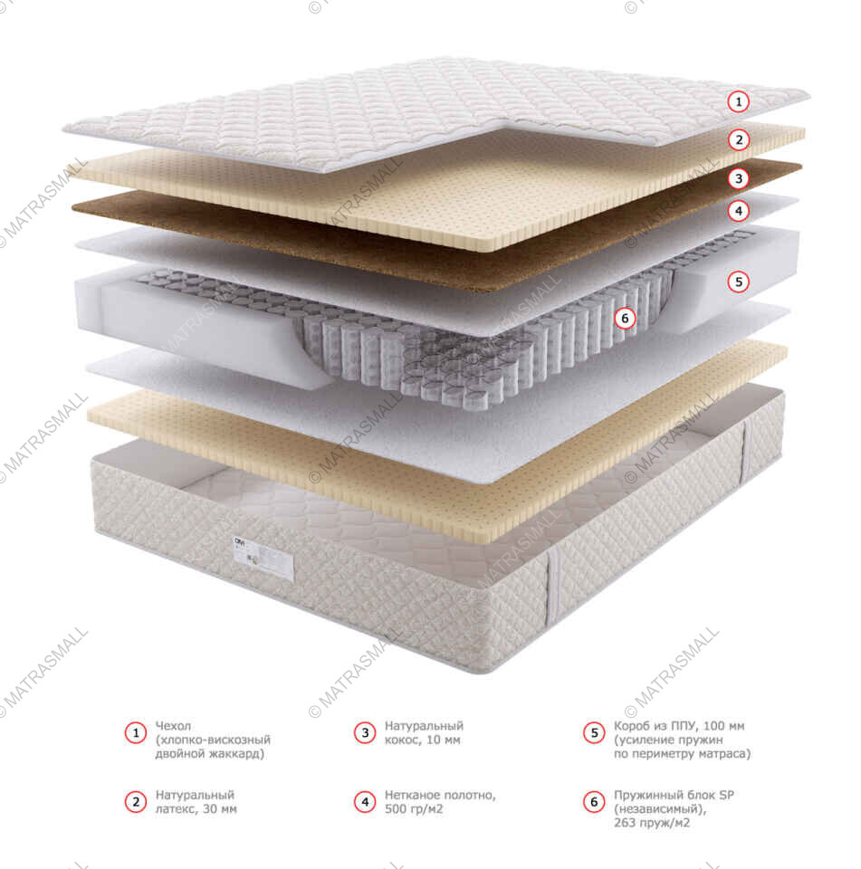 Двусторонний матрас с разными наполнителями по обеим сторонам. С одной стороны — мягкий натуральный латекс и тонкий слой упругой кокосовой койры. Это сочетание материалов позволяет получить умеренную поверхность средней жесткости, которая отлично подойдет тем, кто так и не определился с требуемой жесткостью сторон. С другой стороны — мягкий и комфортный натуральный латекс, прогибающийся очень точечно под нагрузкой. Использование наполнителей из натуральных материалов обеспечивает повышенный срок службы ортопедического матраса.