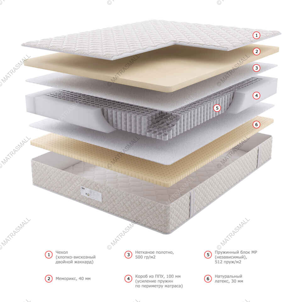 Ортопедический двусторонний матрас со сторонами разной жесткости: с одной стороны — мягкий натуральный латекс, с другой — эластичный меморикс — вязкоупругий термочувствительный материал средней жесткости, который принимает форму, соответствующую очертаниям вашего тела. Он медленно проседает под давлением, не создавая никакого противодавления, пока нагрузка не будет распределена по всей поверхности. После удаления нагрузки, меморикс постепенно принимает исходную форму (эффект «памяти формы»). Ортопедические матрасы с мемориксом великолепно подходят для облегчения и предотвращения болевых ощущений в спине и шее.