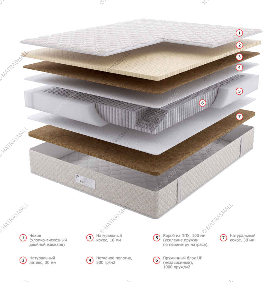 Двусторонний матрас с разными наполнителями по обеим сторонам. С одной стороны — мягкий натуральный латекс и тонкий слой упругой кокосовой койры. Это сочетание материалов позволяет получить умеренную поверхность средней жесткости, которая отлично подойдет тем, кто так и не определился с требуемой жесткостью сторон. С другой стороны — жесткая и упругая кокосовая койра. В отличие от мягкого латекса, который прогибается очень точечно под нагрузкой, плотная кокосовая поверхность прогибается гораздо меньше — плавными, достаточно широкими областями, в основном поддерживая позвоночник в прямом состоянии во время сна. Использование наполнителей из натуральных материалов обеспечивает повышенный срок службы матраса.