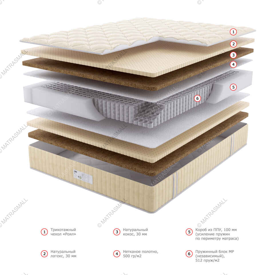 Жесткая и упругая кокосовая койра располагается на амортизирующем слое мягкого натурального латекса.