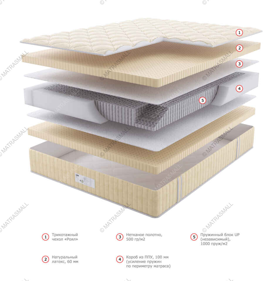 Высокий ортопедический матрас, очень мягкий и комфортный. В качестве наполнителя, по обеим сторонам от пружин, используется двойной натуральный латекс.