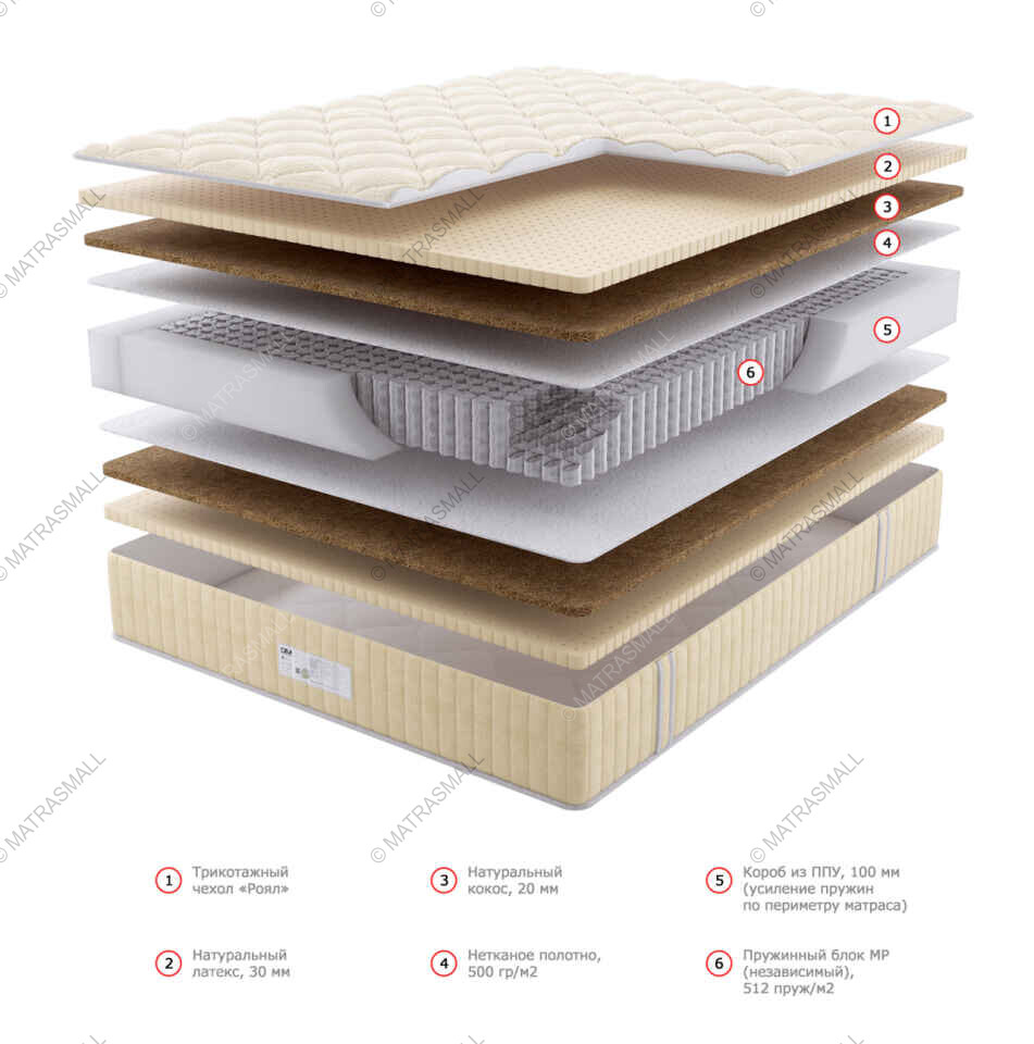 Пружинный ортопедический матрас средней жесткости. В качестве наполнителей для каждой из сторон используется мягкий натуральный латекс и слой упругой кокосовой койры. Это позволяет получить умеренный по свойствам матрас, который отлично подойдет тем, кто так и не определился с требуемой жесткостью сторон. Использование наполнителей из натуральных материалов обеспечивает повышенный срок службы матраса.