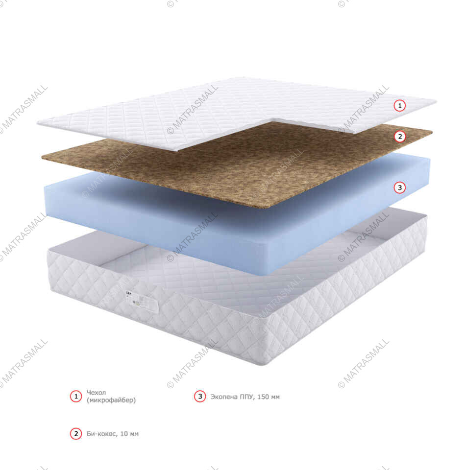 Беспружинный матрас на основе блока из экопены ППУ, придающей матрасу высокие анатомические свойства. Упругий и вязкий блок из экопены высотой 15 см обеспечивает превосходную поддержку тела и способствует равномерному распределению нагрузки. Матрас средней жесткости, с плотной и комфортной поверхностью.