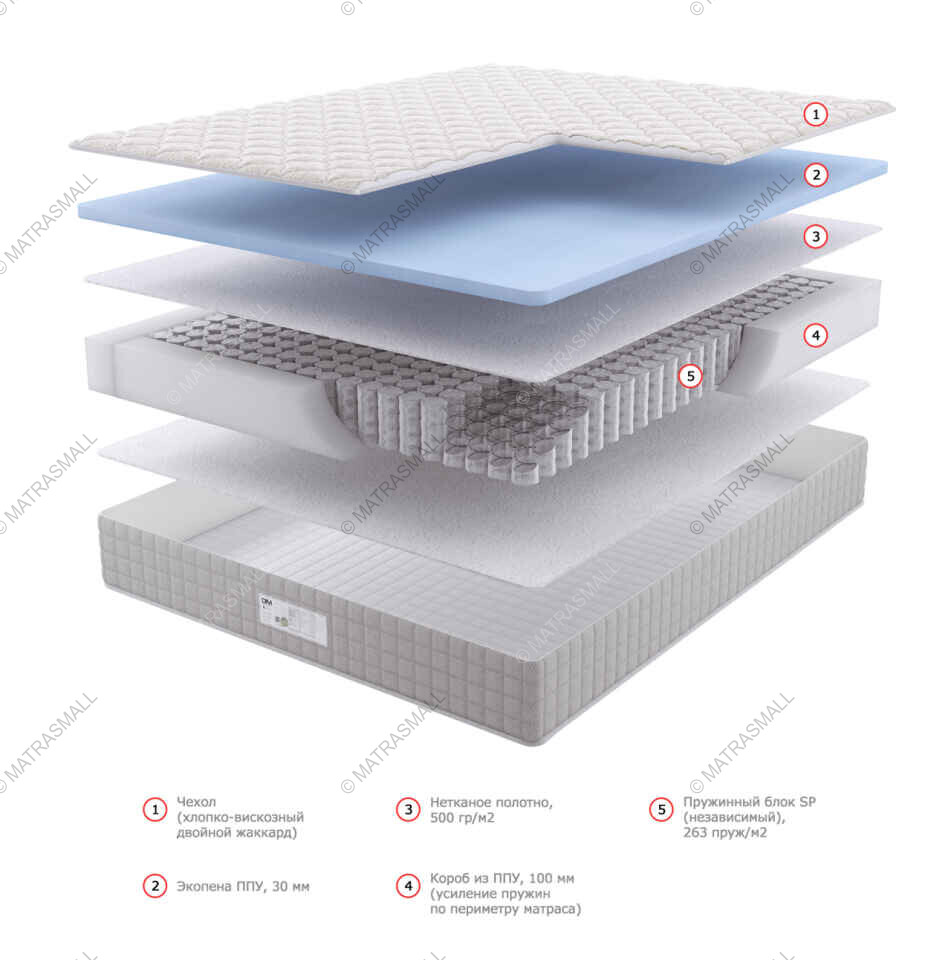 Высота стандартного пружинного блока SP (TFK) составляет 14 см. Также, по желанию клиента, доступна бесплатная опция с пружинным блоком высотой 10 см, за счет которого весь матрас становится ниже на 4 см, по сравнению со стандартной моделью.