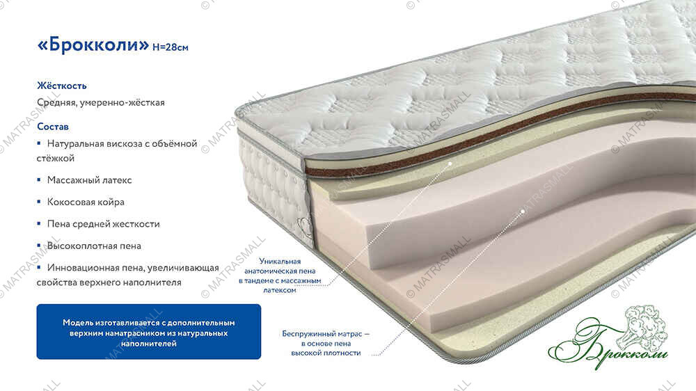 Матрас Брокколи представляет собой отличное сочетание умеренной жёсткости и комфорта. Состав матраса включает в себя чехол из натуральной вискозы с объёмной стёжкой, массажный латекс, кокосовую койру, пену средней жесткости, высокоплотную пену и инновационную пену, увеличивающую свойства верхнего наполнителя.