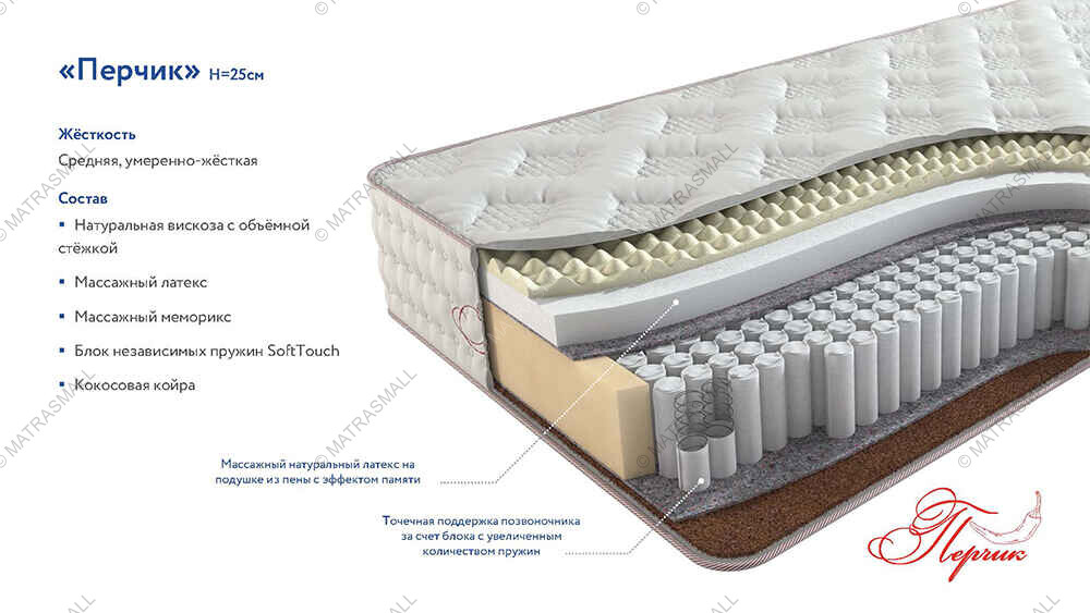 Матрас Перчик — это средне-жесткий матрас с умеренно-жёсткой поверхностью. Он обеспечивает комфортный отдых благодаря использованию натуральной вискозы с объемной стежкой, массажного латекса, массажного меморикс и блока независимых пружин SoftTouch. Кокосовая койра добавляет дополнительную прочность и упругость матрасу.