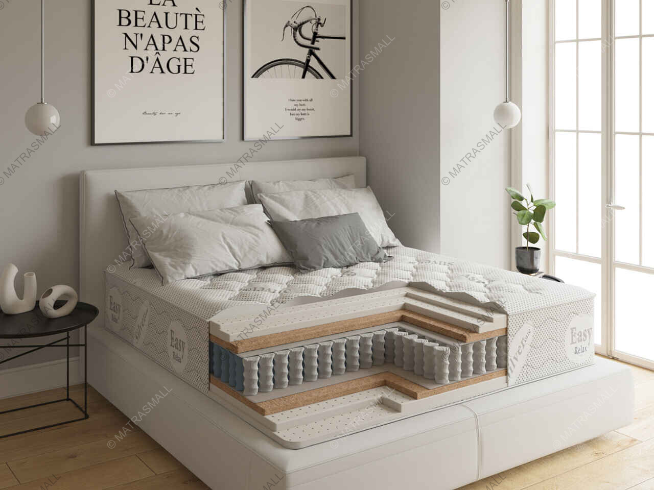 Довольно высокий и мягкий матрас, в основе которого ‒ независимые пружины и 100% натуральный латекс, чередующийся с контурным латексом. 5 анатомических зон для оптимального ортопедического эффекта. Комфортные слои защищены от протирания войлоком. Чехол сделан из хлопкового трикотажа с волокнами шерсти и бамбука.