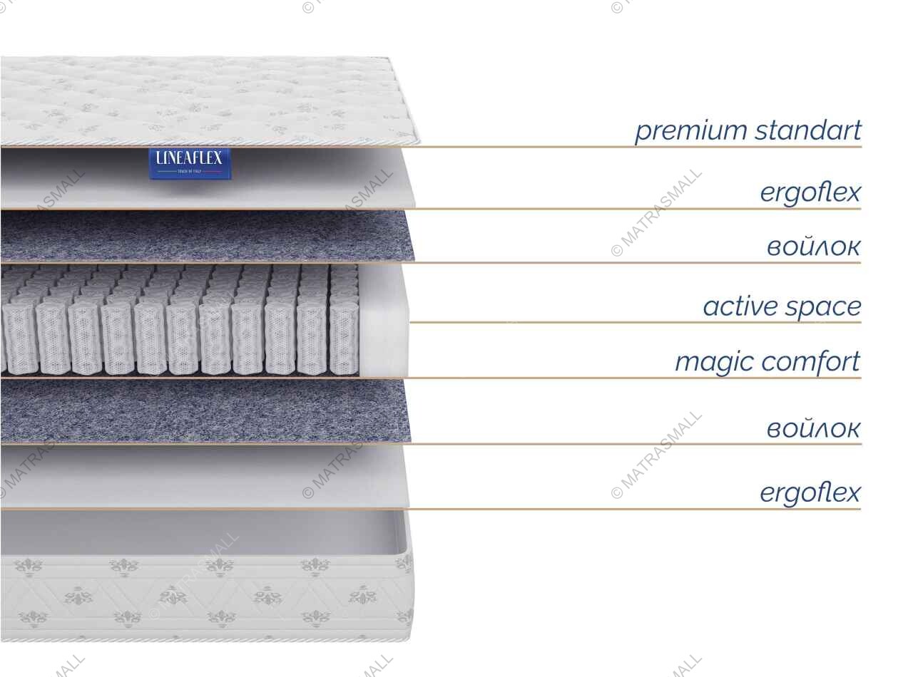 Active space – это пружинный блок Magic Comfort, армированный по системе Ecobond без использования устаревших войлочных материалов и высокоэластичная пена Ergoflex по периметру матраса, которая защищает его от провисания и усиливает жесткость края.