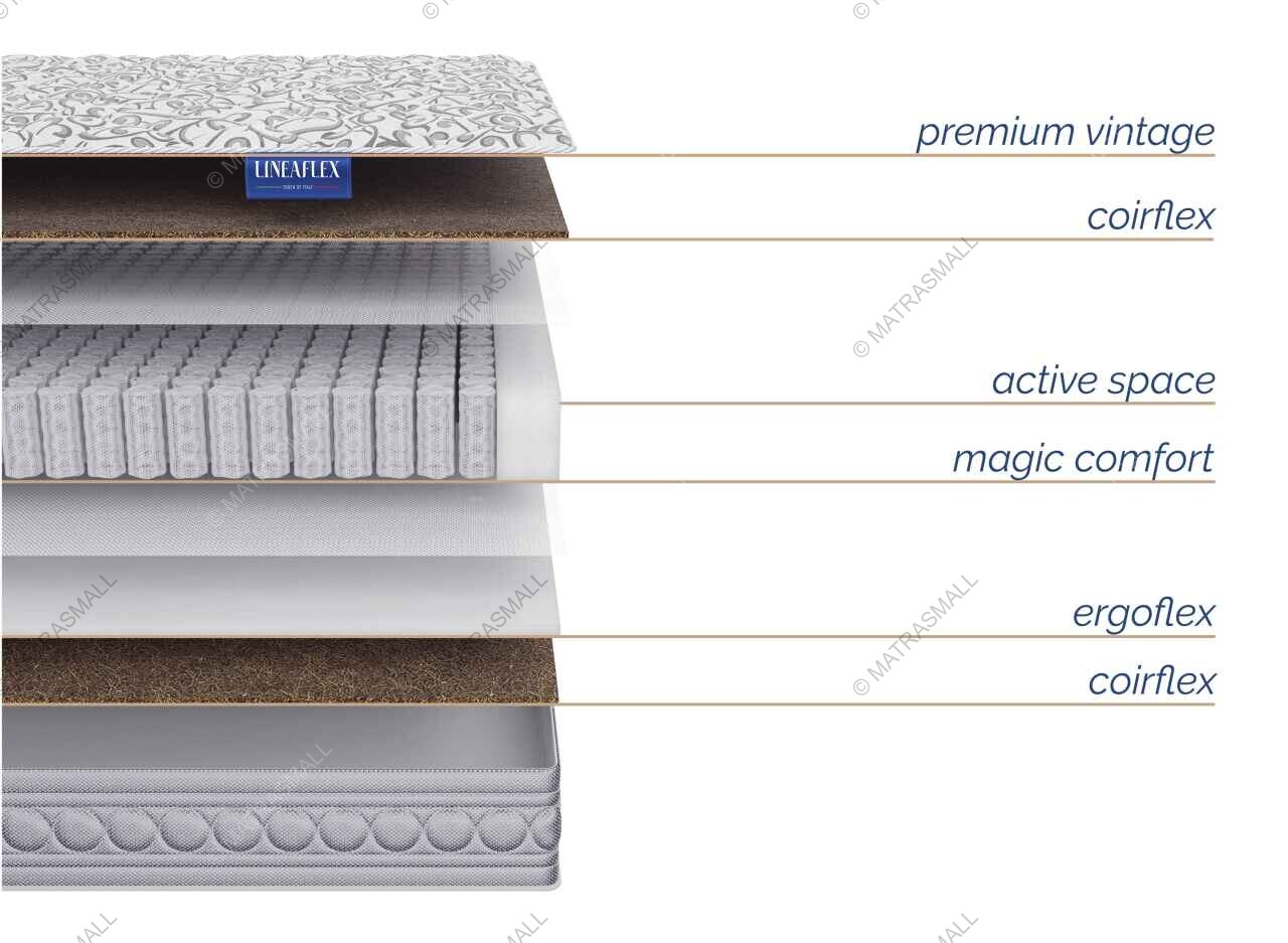 Матрас имеет несущую систему Active Space – это пружинный блок Magic Multi, армированный по системе Ecobond без использования устаревших войлочных материалов, и высокоэластичная пена Ergoflex по периметру матраса, которая защищает его от провисания и усиливает жесткость края.
