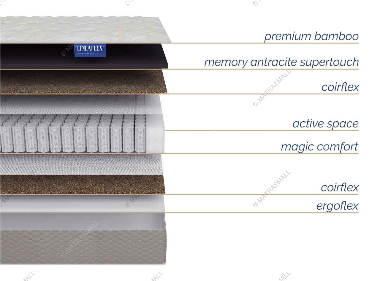 Пена с эффектом памяти Memory Antracite Supertouch – сверхэластичная пена, которая запоминает и повторяет форму тела с точностью до миллиметра. Полностью гипоаллергенна, и эффективно отводит влагу, потому что содержит частички угля антрацита. Гасит толчки и вибрации, не оказывает ответного давления на мышцы и суставы, способствует свободному кровообращению и насыщению клеток кислородом.