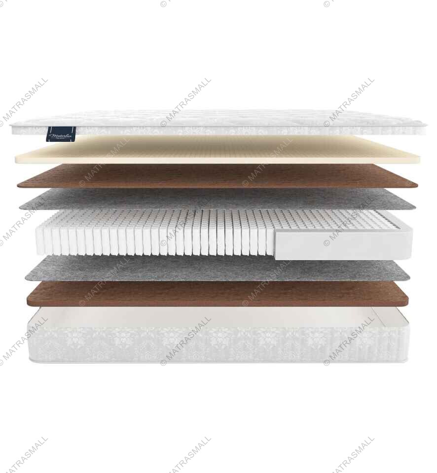 Двухсторонний матрас с различной степенью жесткости на основе блока независимых пружин в сочетании с натуральными материалами: латексированного кокоса, 100% латекса и термофиксированного фетра.