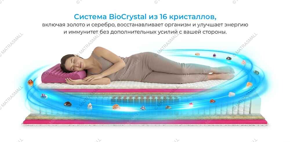 Основное внимание привлекает ткань Абсолют с интегрированной системой BioCrystal, состоящей из 16 кристаллов, включая золото и серебро. Восстанавливает организм без участия человека, достаточно использовать продукцию с кристаллическим составом. Улучшает поток энергии по телу, укрепляет иммунную систему и общее состояние организма, повышая его эффективность в повседневной жизни. Увеличивает эффект благодаря добавлению золота (генератора энергии) и серебра (успокаивающего действия).