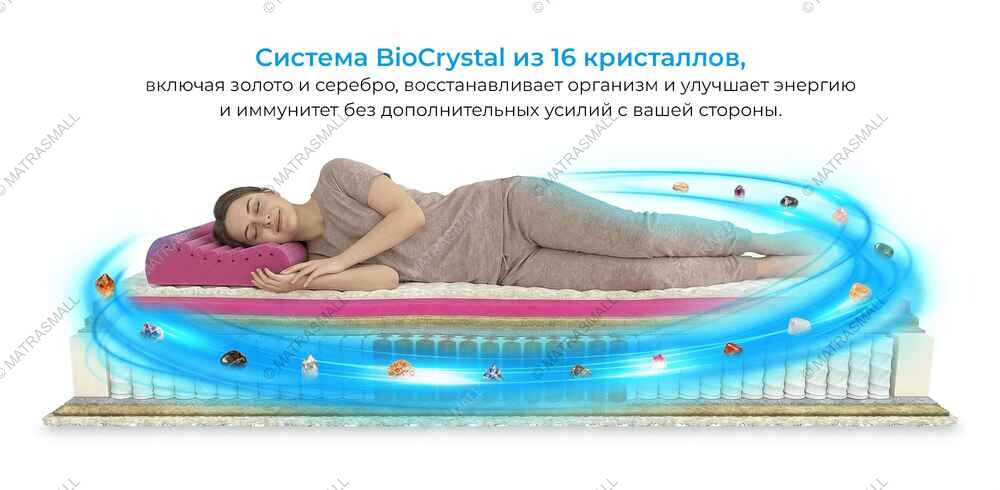 Основное внимание привлекает ткань Абсолют с интегрированной системой BioCrystal, состоящей из 16 кристаллов, включая золото и серебро. Восстанавливает организм без участия человека, достаточно использовать продукцию с кристаллическим составом. Улучшает поток энергии по телу, укрепляет иммунную систему и общее состояние организма, повышая его эффективность в повседневной жизни. Увеличивает эффект благодаря добавлению золота (генератора энергии) и серебра (успокаивающего действия).