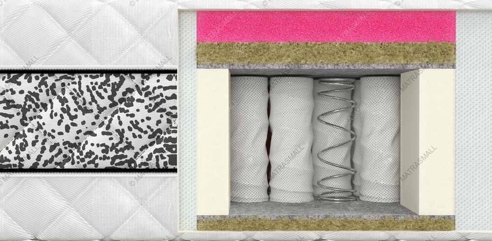 С одной стороны матраса Mousse Neropur – натуральная пена-мусс из Испании с гипнотическим эффектом. Инновационный испанский материал с эффектом успокоения и расслабления Neropur. Это очень мягкий материал, при этом прекрасно поддерживает ваше тело благодаря свойствам упругости. Neropur отлично "дышит" и обладает очень высокой воздухопроницаемостью благодаря очень пористой структуре. Mousse Neropur отлично пропускает влагу, не задерживая ее внутри, благодаря чему ваш сон становится еще более комфортным.