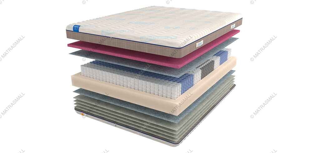 Основу матраса составляет блок независимых пружин Nine Touches. Благодаря наличию в блоке 7-ми зон комфорта, он обеспечивает отличную поддержку для тела человека. Пространство между пружинами дополнены специальными вставками из мягкой пены, которые, в конечном итоге, создают уже 9 зон комфорта. Вставки из пены принимают на себя часть нагрузки от блока пружин, придают каждой зоне комфорта дополнительную упругость, регулируя при этом жесткость поверхности. В общей сложности пружинная система насчитывает 290 обычных независимых пружин и 100 "пенопружин". Итого на квадратный метр получается 390 пружин. Этого вполне достаточно для того, чтобы данная система обеспечивала ортопедический эффект в высокой степени.