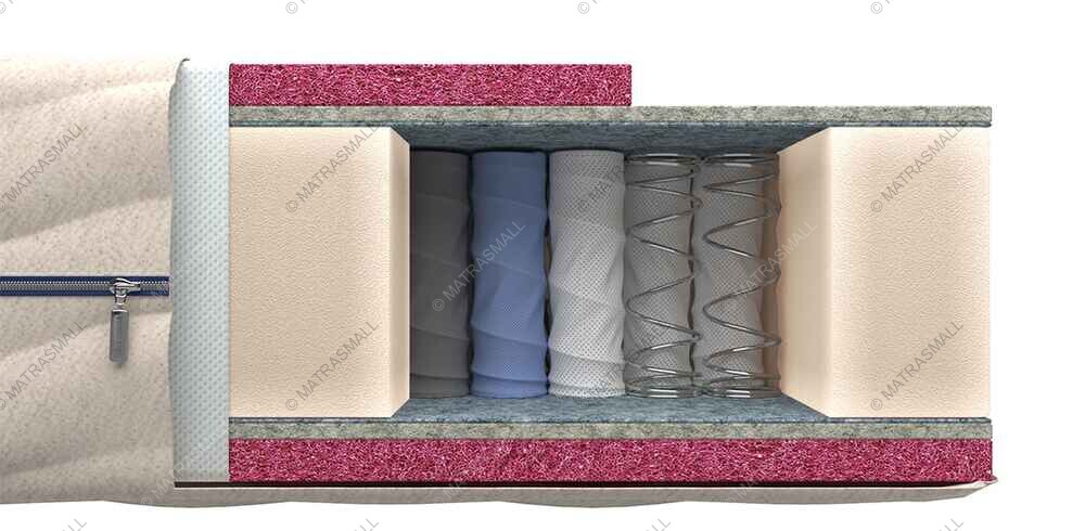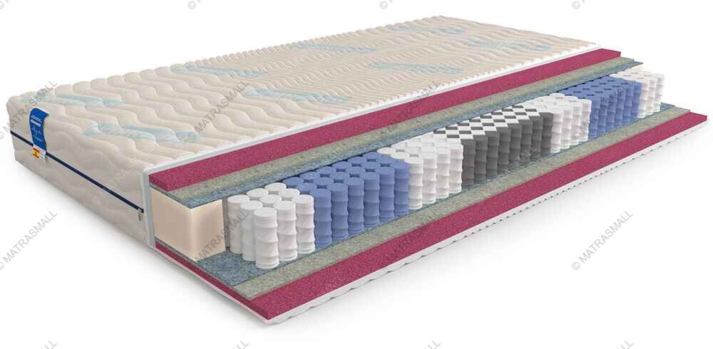 Основу матраса составляет блок независимых пружин Nine Touches. Благодаря наличию в блоке 7-ми зон комфорта, он обеспечивает отличную поддержку для тела человека. Пространство между пружинами дополнены специальными вставками из мягкой пены, которые, в конечном итоге, создают уже 9 зон комфорта. Вставки из пены принимают на себя часть нагрузки от блока пружин, придают каждой зоне комфорта дополнительную упругость, регулируя при этом жесткость поверхности. В общей сложности пружинная система насчитывает 290 обычных независимых пружин и 100 "пенопружин". Итого на квадратный метр получается 390 пружин. Этого вполне достаточно для того, чтобы данная система обеспечивала ортопедический эффект в высокой степени.