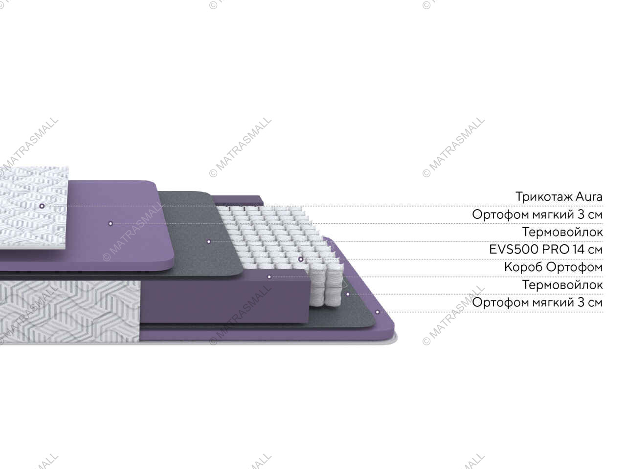 В составе используется мягкий, но плотный Ортофом и независимый пружинный блок EVS500 PRO. Такая система равномерно распределяет нагрузку, предотвращая дискомфорт во время отдыха.