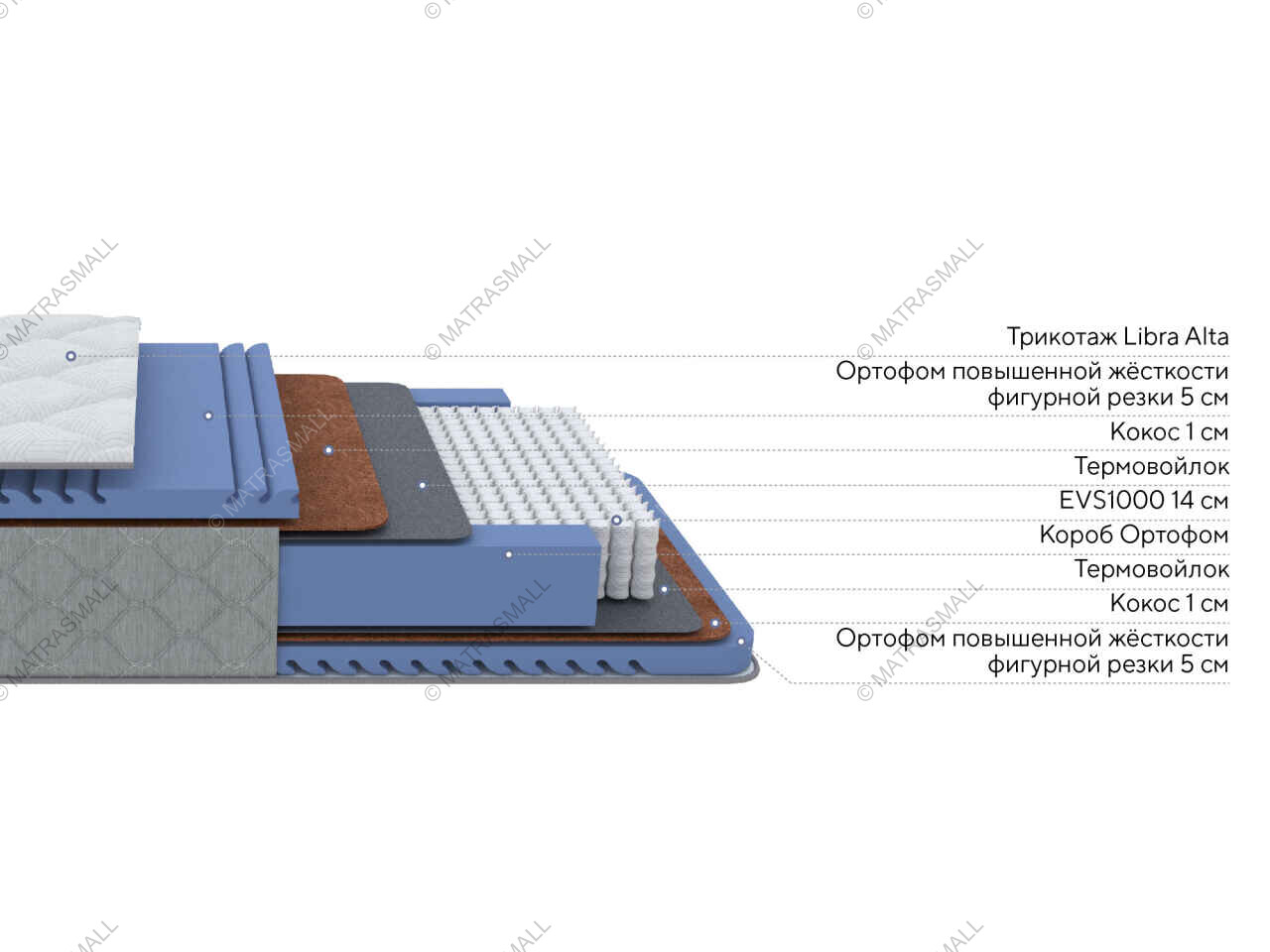 Ортофом повышенной жесткости - пена с повышенными показателями жесткости и плотности. Она придает матрасу высокую жесткость, менее чувствительна к прилагаемому давлению и отличается высокими поддерживающими характеристиками. Благодаря ячеистой резке оказывает массажный эффект.