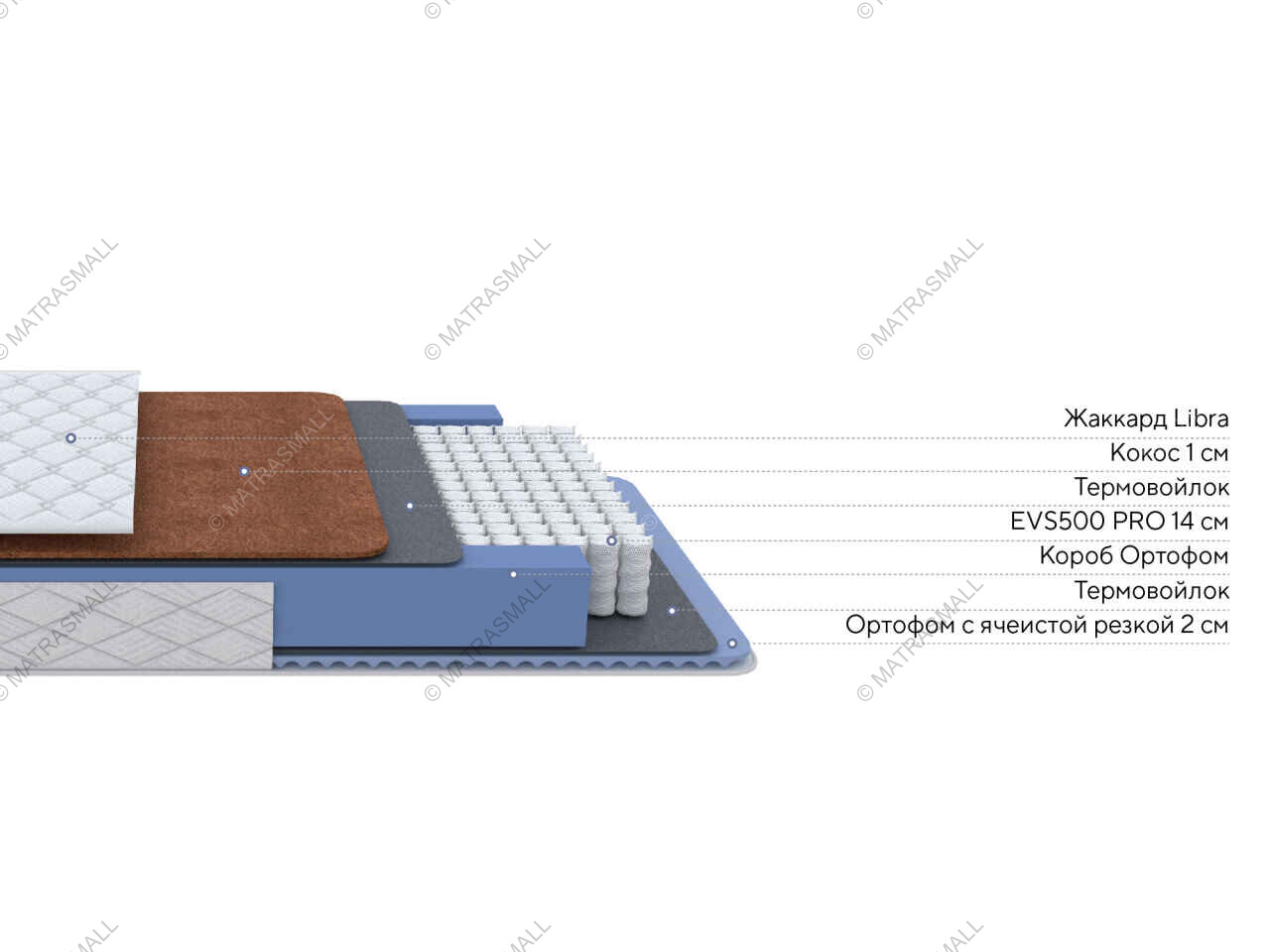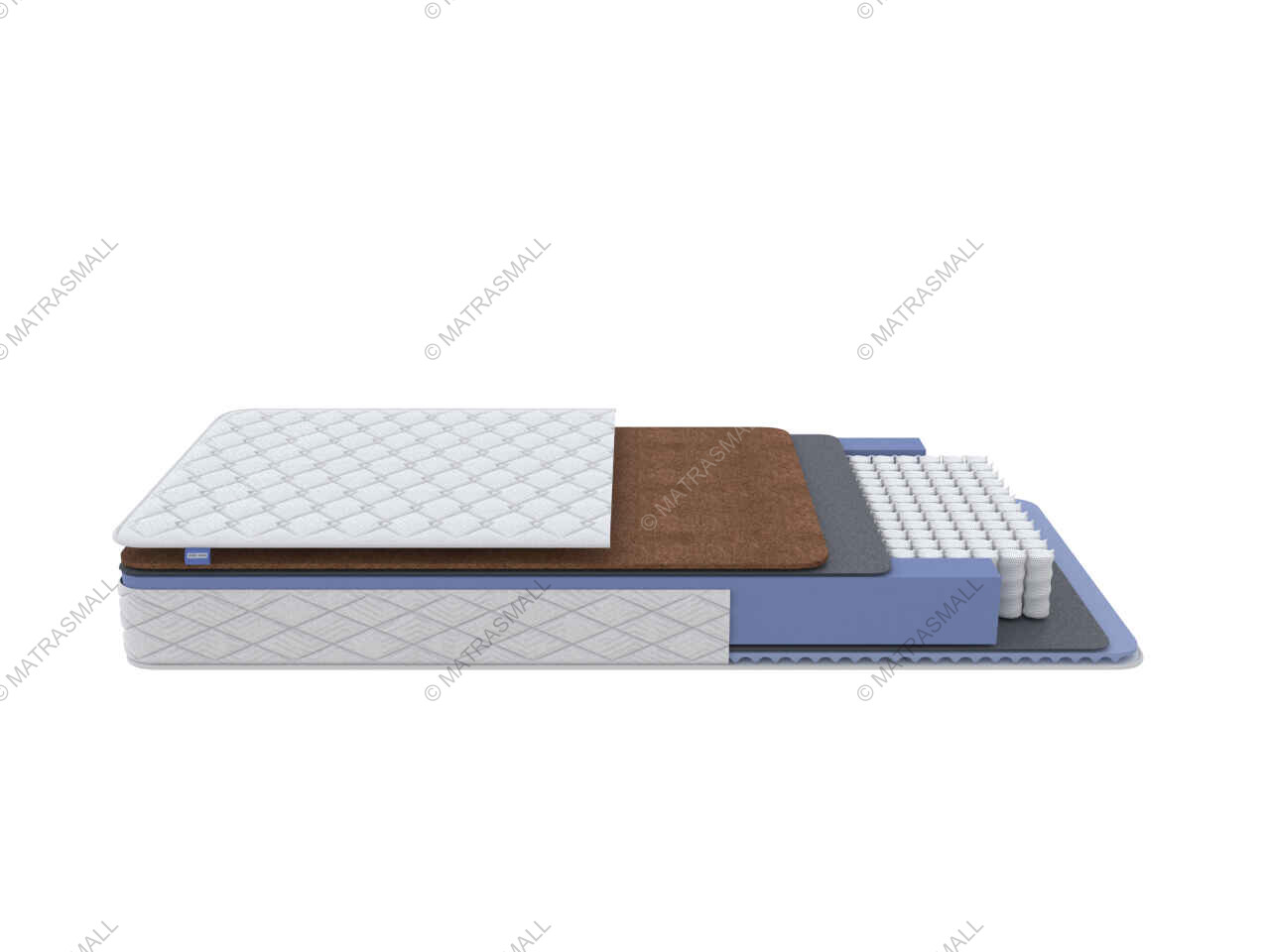 С одной стороны низкую жёсткость и лёгкий эффект «массажа» создаёт пена Ортофом с ячеистой резкой, а после переворачивания правильный сон обеспечивает кокосовая койра, совместно с независимым пружинным блоком, корректно распределяя нагрузку и формирую универсальную среднюю жёсткость.