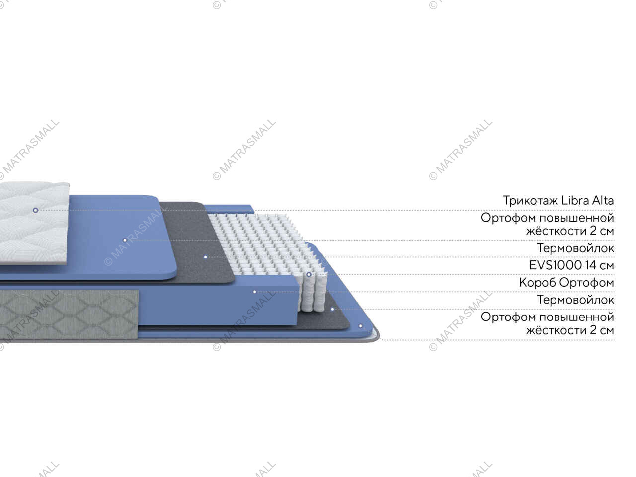 В комфортных слоях модели Libra Light 1000 M используется современный материал Ортофом повышенной жёсткости - пена с повышенными показателями жесткости и плотности. Она придает матрасу высокую жесткость, менее чувствительна к прилагаемому давлению и отличается высокими поддерживающими характеристиками.