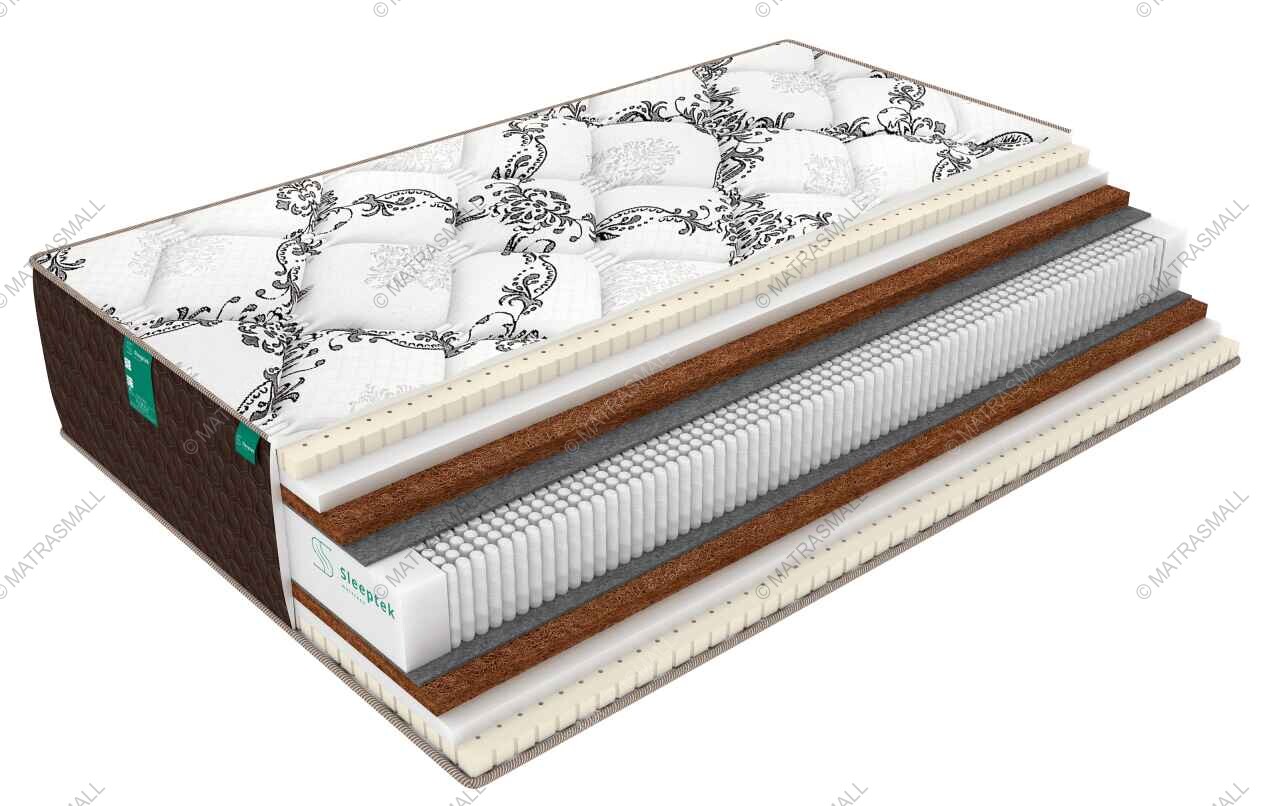 Койра – жесткий волокнистый материал – усиливает ортопедические качества пружинного блока и улучшает состояние позвоночника. Натуральный и искусственный латекс способствуют оптимальному кровообращению, придают матрасу комфорт и делают сон здоровым и крепким. По периметру матраса предусмотрено усиление из плотной пены, что продлевает срок эксплуатации матраса.