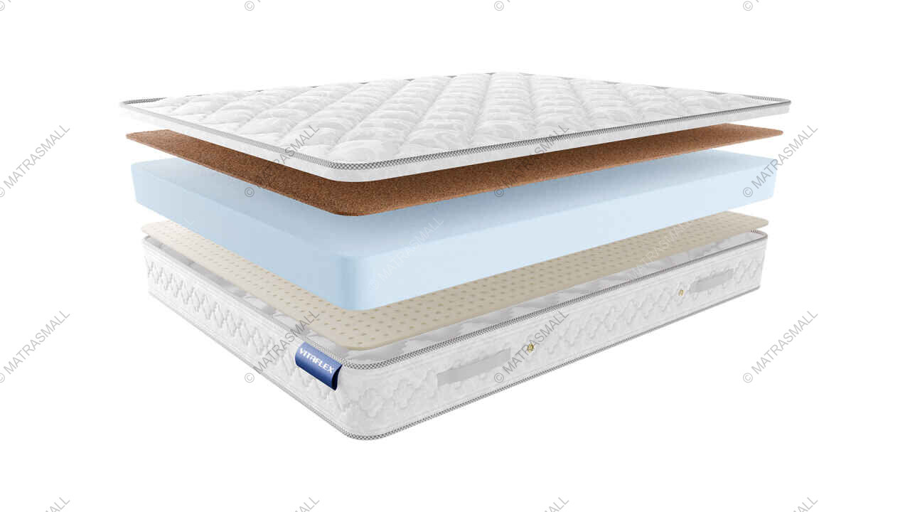 Жесткая сторона образована кокосовой койрой, более мягкая и упругая – натуральным латексом. Натуральные материалы пропускают воздух и влагу, делая матрас очень износостойким.