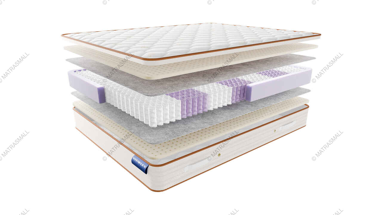 Слои латекса смягчают настил поверх пружинного блока. Нежный материал бережно обволакивает тело, подстраивается под контуры. Перфорированные плиты хорошо дышат и поддерживают здоровый микроклимат внутри матраса.