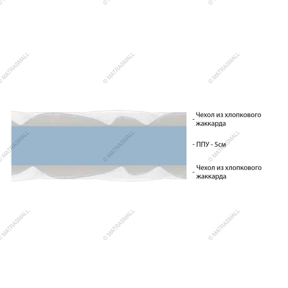 Матрас состоит из слоя искусственного латекса. Искусственный латекс – абсолютно безопасный для здоровья человека материал, обладает высокой воздухопроницаемостью, гипоаллергенностью, хорошим тепло- и влагообменом, выдерживает сильные и продолжительные нагрузки.