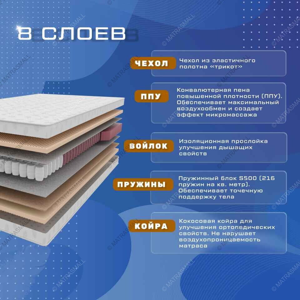 Пружинный блок S500 с независимыми бочкообразными пружинами (256 пружин на квадратный метр) обеспечивает точечную поддержку тела.