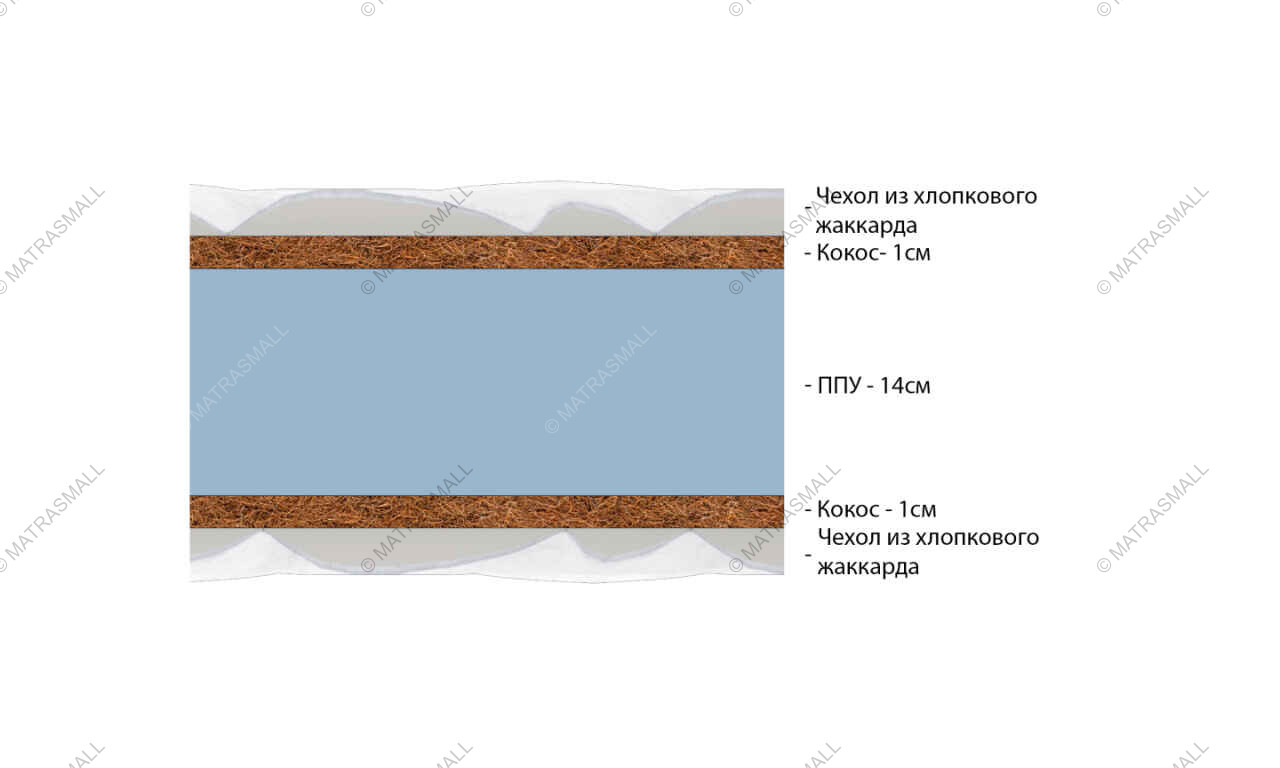 Слои кокосовой латексированной койры придают поверхности необходимую жесткость. Материал отлично справляется с нагрузками и долго сохраняет форму.
