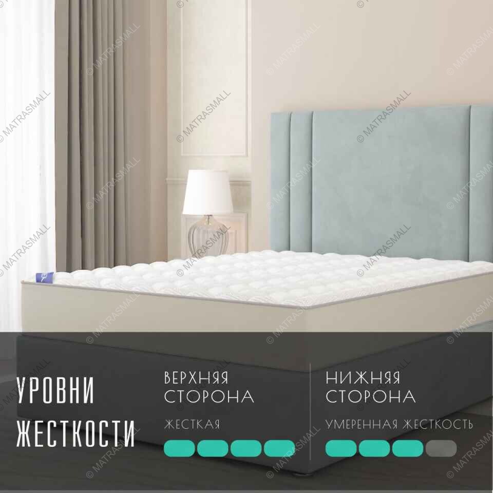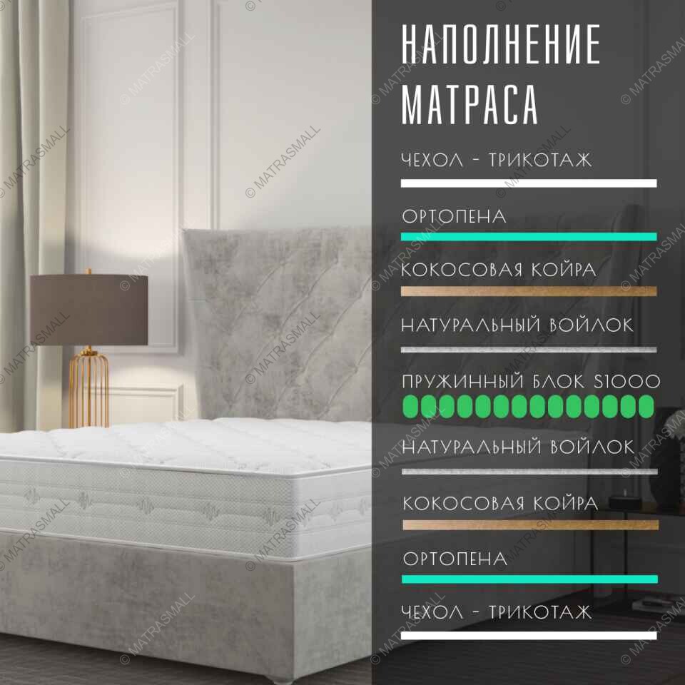 В основе матраса лежит независимый пружинный блок S1000. Данный пружинный блок долговечен и прочен за счет большого количества пружин на спальное место - около 1250 пружин. Пружины работают автономно, поддерживают все тело и позвоночник в анатомически правильном положении.