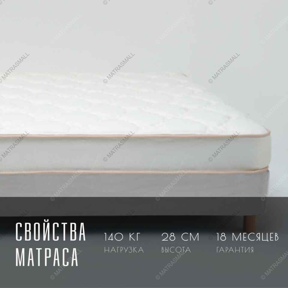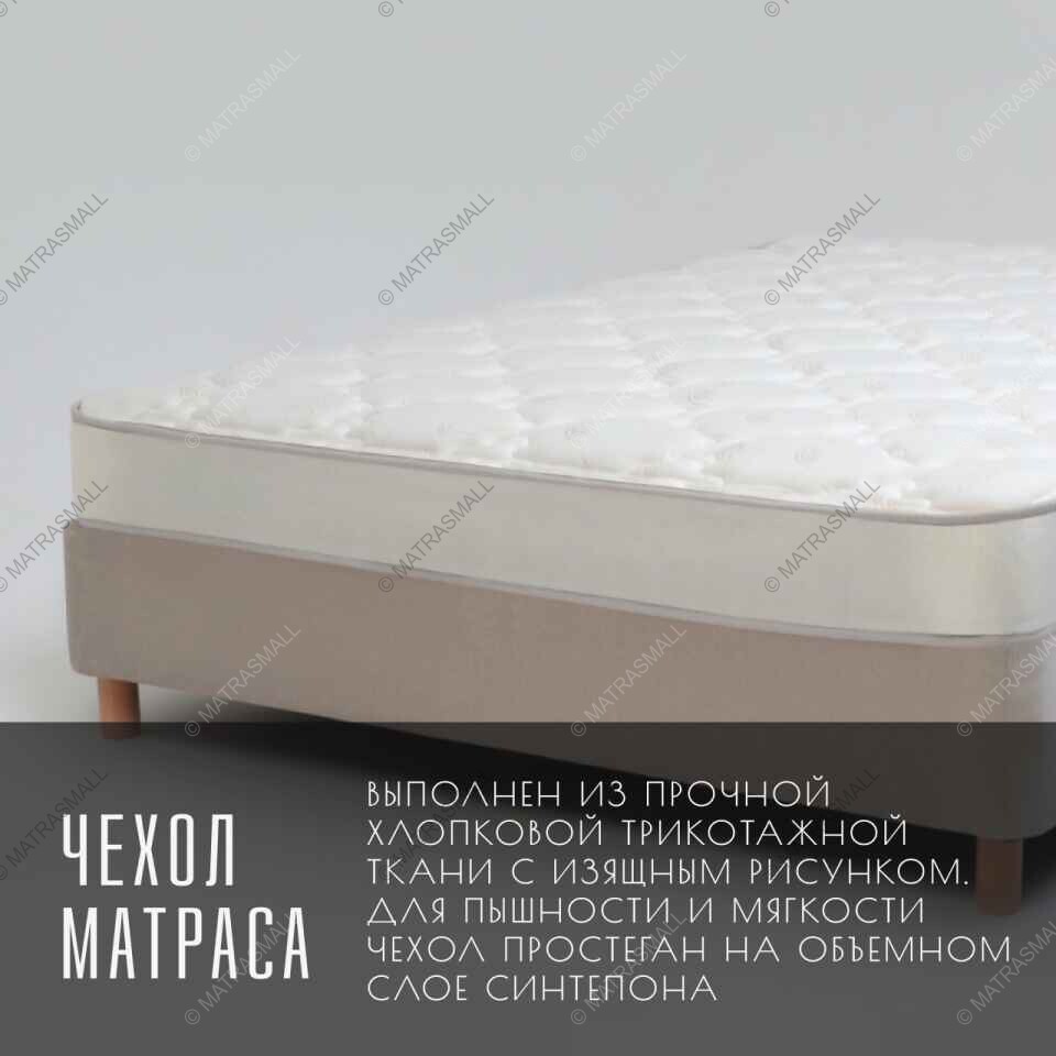 Чехол матраса выполнен из прочной хлопковой трикотажной ткани с изящным рисунком. Для пышности и мягкости чехол дополнительно простеган на объемном слое холлкона плотностью 400 г/м² с использованием ППУ. Красивый внешний вид чехла сочетается с приятной текстурой.