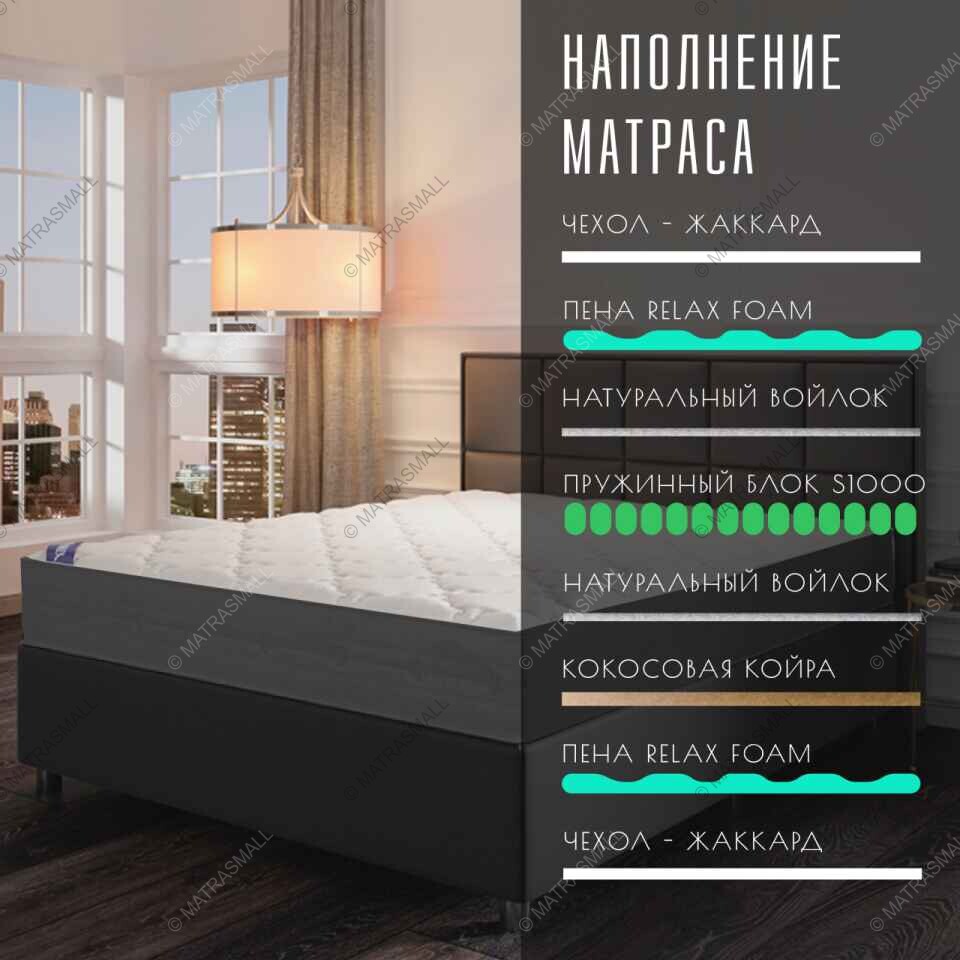 В основе матраса лежит независимый пружинный блок S1000. Данный пружинный блок долговечен и прочен за счет большого количества пружин на спальное место - около 1250 пружин. Пружины работают автономно, поддерживают все тело и позвоночник в анатомически правильном положении.
