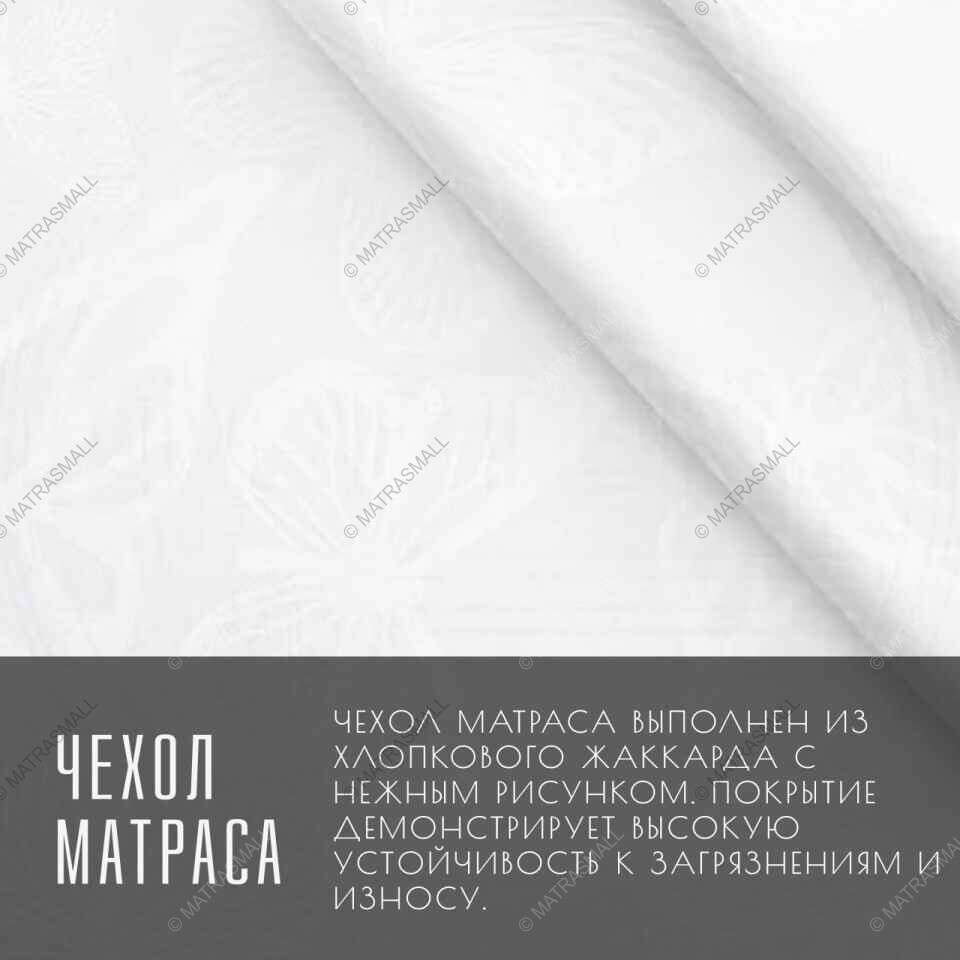 Чехол матраса выполнен из хлопкового жаккарда с нежным рисунком и бурлетом серого цвета. Для комфорта и пышности чехол простеган на слое холкона плотностью 200 г/м². Такое покрытие гарантирует высокую устойчивость к загрязнениям и износу.