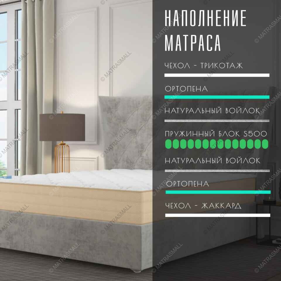 В основе матраса лежит независимый пружинный блок S500. На одно спальное место приходится 500 пружин. Каждая пружина находится в чехле и изолирована от соседних. Такая конструкция позволяет обеспечить точечное распределение нагрузок.