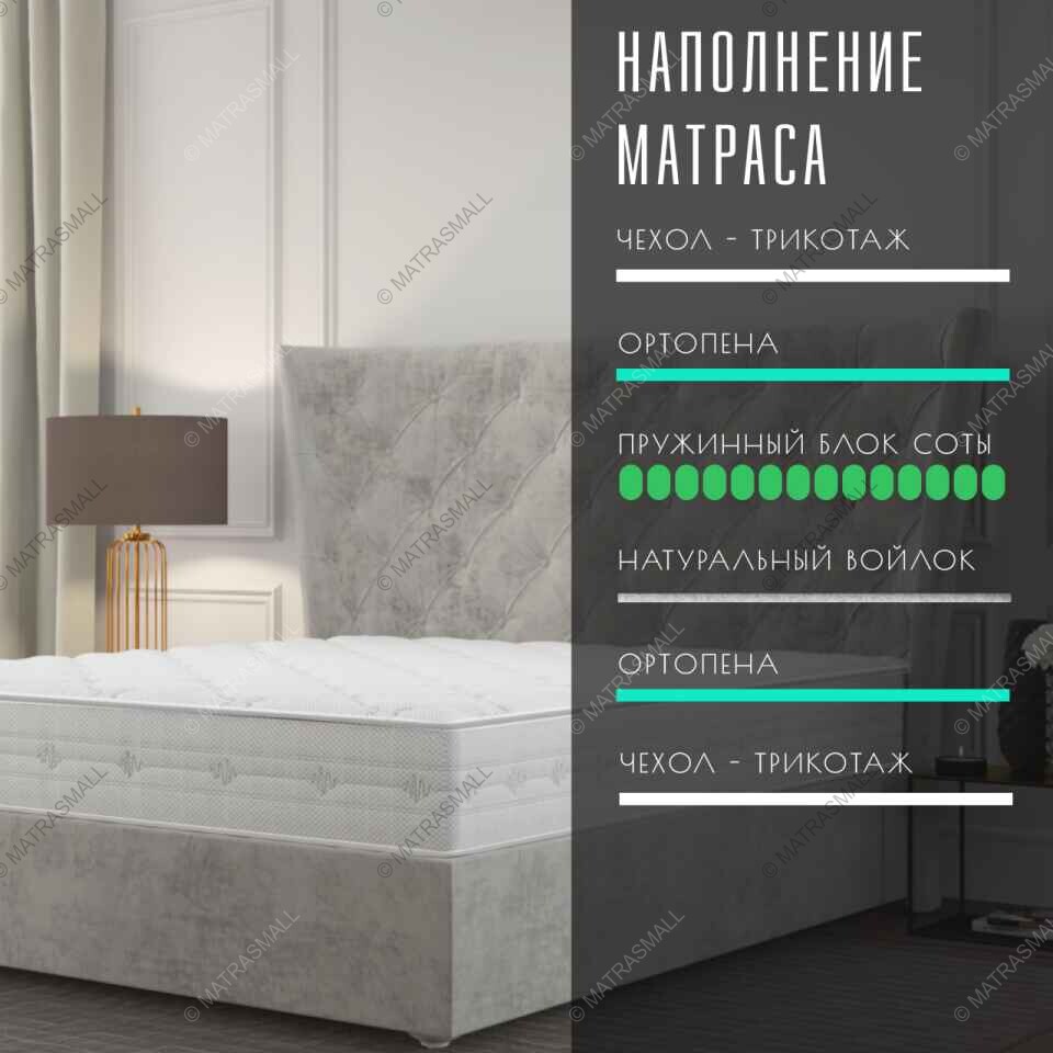 Основу ортопедического матраса представляет независимый пружинный блок "Соты". Пружины находятся в индивидуальных мешочках из спанбонда, но расположены они в шахматном порядке. При таком расположении на квадратный метр приходится около 310 пружин, они заполняют все пространство внутри матраса, без промежутков. Благодаря такому плотному расположению пружин матрас с блоком "Соты" способен выдерживать повышенные нагрузки и обладает хорошим ортопедическим эффектом.